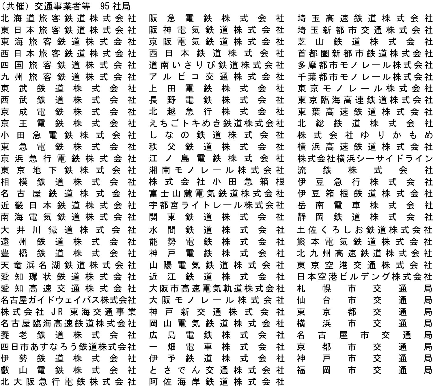 一般社団法人日本民営鉄道協会、一般社団法人日本地下鉄協会、社会福祉法人日本視覚障害者団体連合、公益財団法人日本盲導犬協会、東京商工会議所、全国旅館ホテル生活衛生同業組合連合会