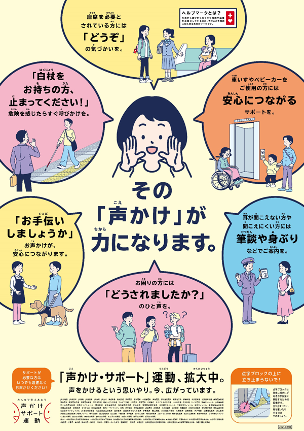 「声かけ・サポート」運動は、お客さまに鉄道などの施設を安全に安心してご利用いただけるよう、お困りのお客さまに対して社員等から積極的に声をおかけするとともに周囲のお客さまからもお声かけにご協力いただく取り組みです。
